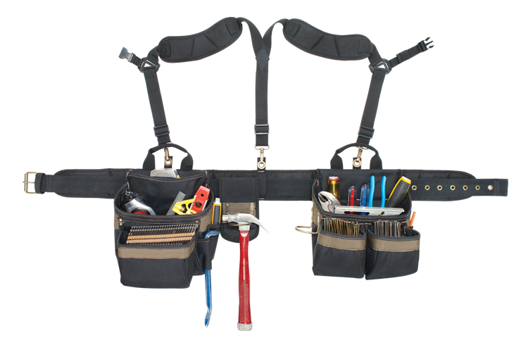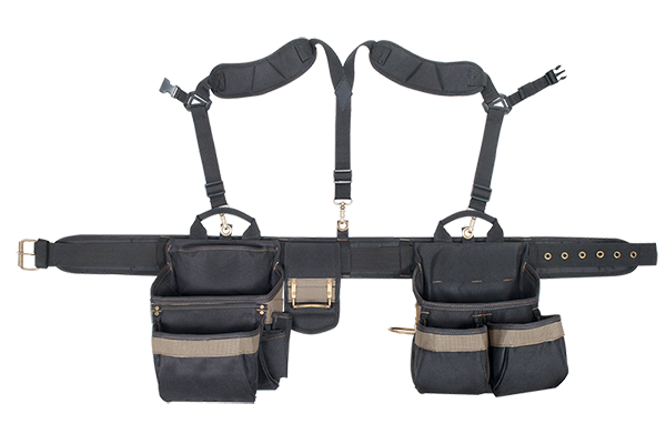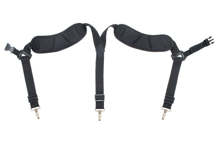 Completely adjustable, padded suspenders engineered to hold and distribute weight comfortably evenly without strain on lower back and hips.